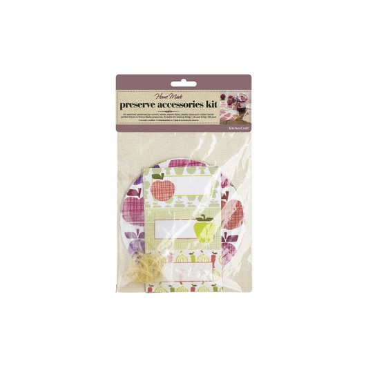 Набір складається з 24 комплектів для консервування з колекції Home Made: декоративні накладки з малюнками овочів і фруктів 4-х видів, пластикові кола, оброблені воском кола, гумки, наклейки на банку.